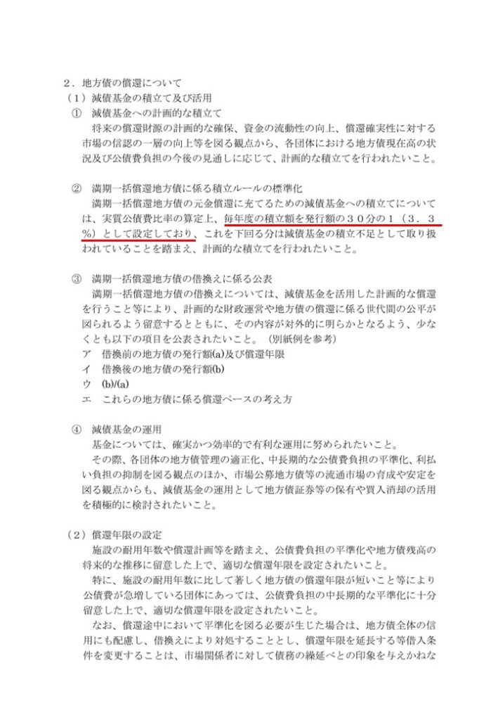 当該ページにつきましては、満期一括償還で発行した市債の償還に備えて、減債基金に計画的に積み立てることについて記載したものでございます。