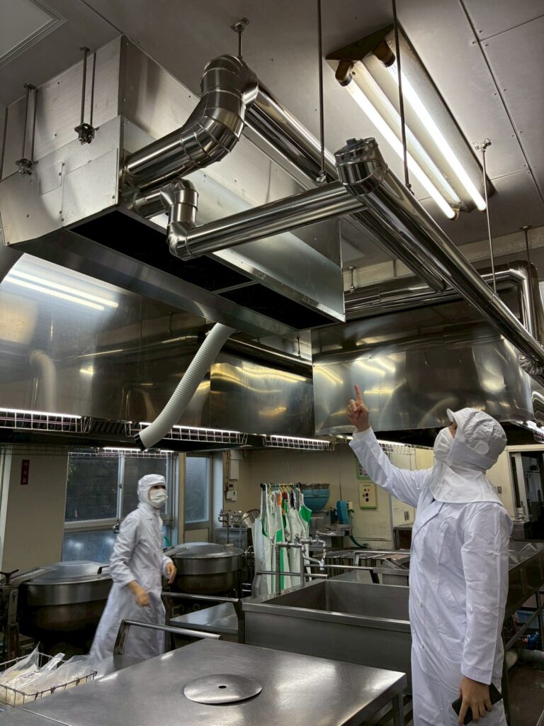 昨年、室温が50度を超えた富士見台小学校の給食室へ「短い工期で設置できる空調設備」が試験的に設置されたのを受け、現地視察を行いました。