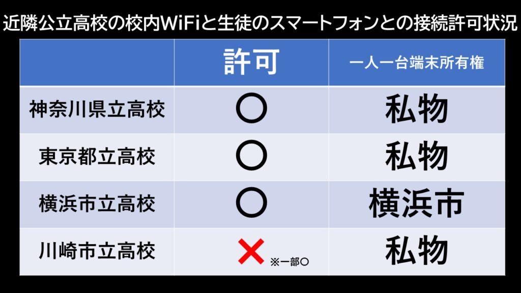 神奈川県立高校、東京都立高校、横浜市立高校全て、生徒の私物であるスマホと校内WIFIの接続を認めていました。ポイントはなんなのかそれぞれ確認しましたら、東京都も神奈川県も端末は各家庭で購入している私物なので、同じく私物である生徒個人のスマホとの接続も認めている。私物か否かという点に判断基準を設けたということなんです。一方で横浜市は一人一台端末を市が購入し、生徒達に貸し出しています。本来、これがあるべき姿だと思いますが、学習用端末は生徒個人の私物でないにも関わらず「横浜市新学習用ネットワーク(BYOD回線)の利用ルール」を定め、生徒個人のスマートフォン等の端末との接続を認めています。