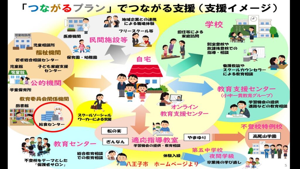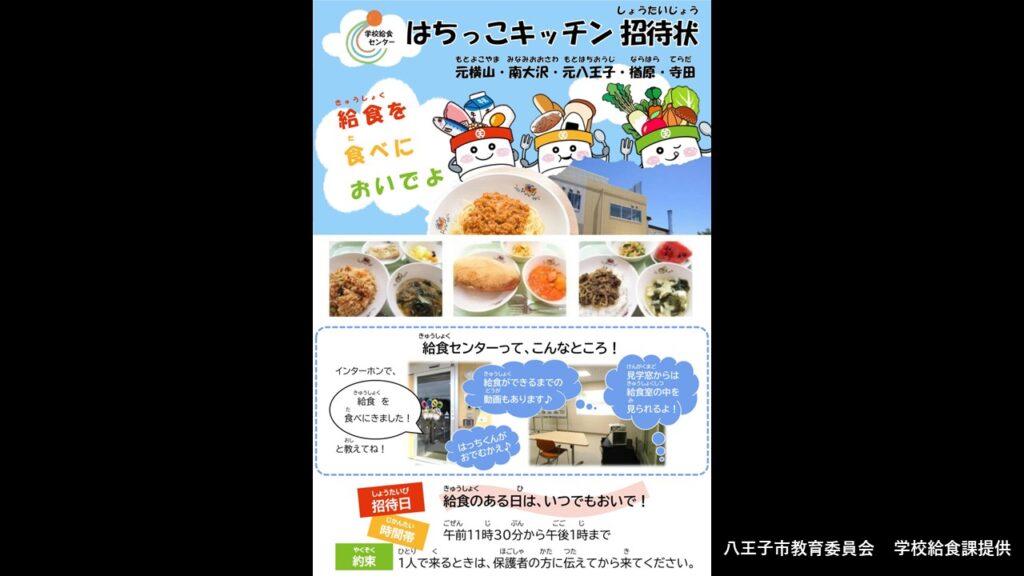 先日、八王子市が取り組む、給食センターで不登校児童生徒に対して給食の提供を行う「不登校児への食支援」を視察してきました。この事業は、教育長の発案をきっかけに2023年度から始まったもので、ディスプレイお願いいたします。